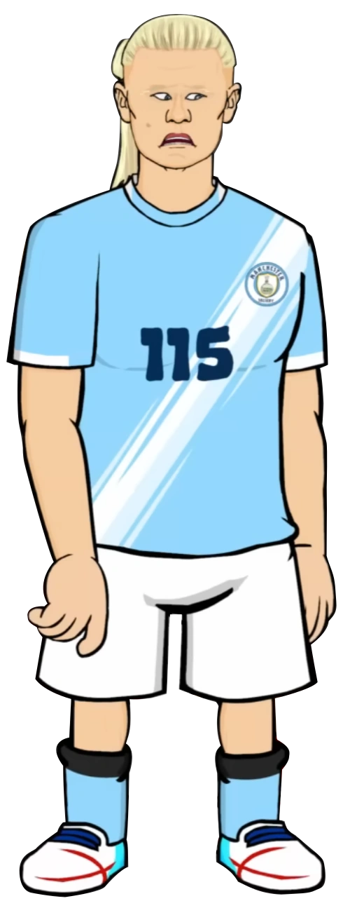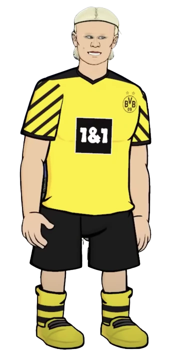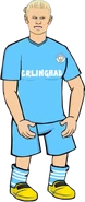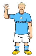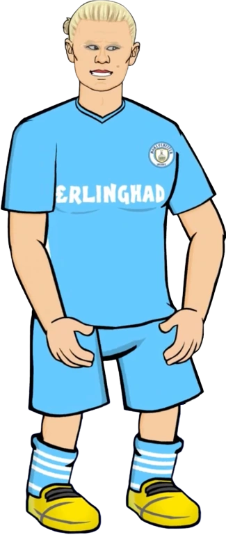 Haaland has long blond hair, making people call him a mop. Haaland has a very light skin color and blue eyes, matching the kit of his club, Manchester Sheikhy. Haaland is also tall alongside having a tall neck.